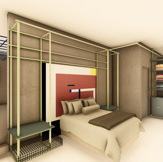Uyuma alanında yatak başlığında oluşturan metal profiller giyinme odası ve diğer depolama alanlarını da oluturmaktadır. Yatak başlığında sanatçımızın projemize ilham veren eseri bulunmaktadır.